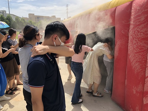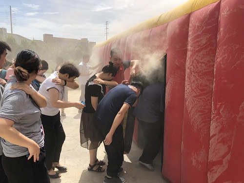 隨后,各員工在指引員的指揮下有序地用手臂捂住口鼻、彎下身體,進(jìn)入消防演習(xí)帳篷,經(jīng)過(guò)通道到達(dá)操場(chǎng)。